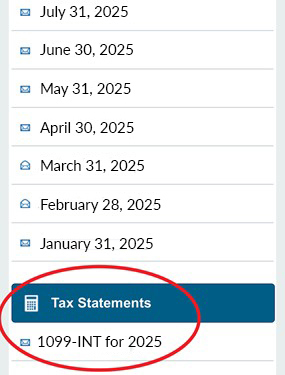 In the Online Banking Mobile App, go to Online eStatements and scroll down to the "Tax Statements" section.